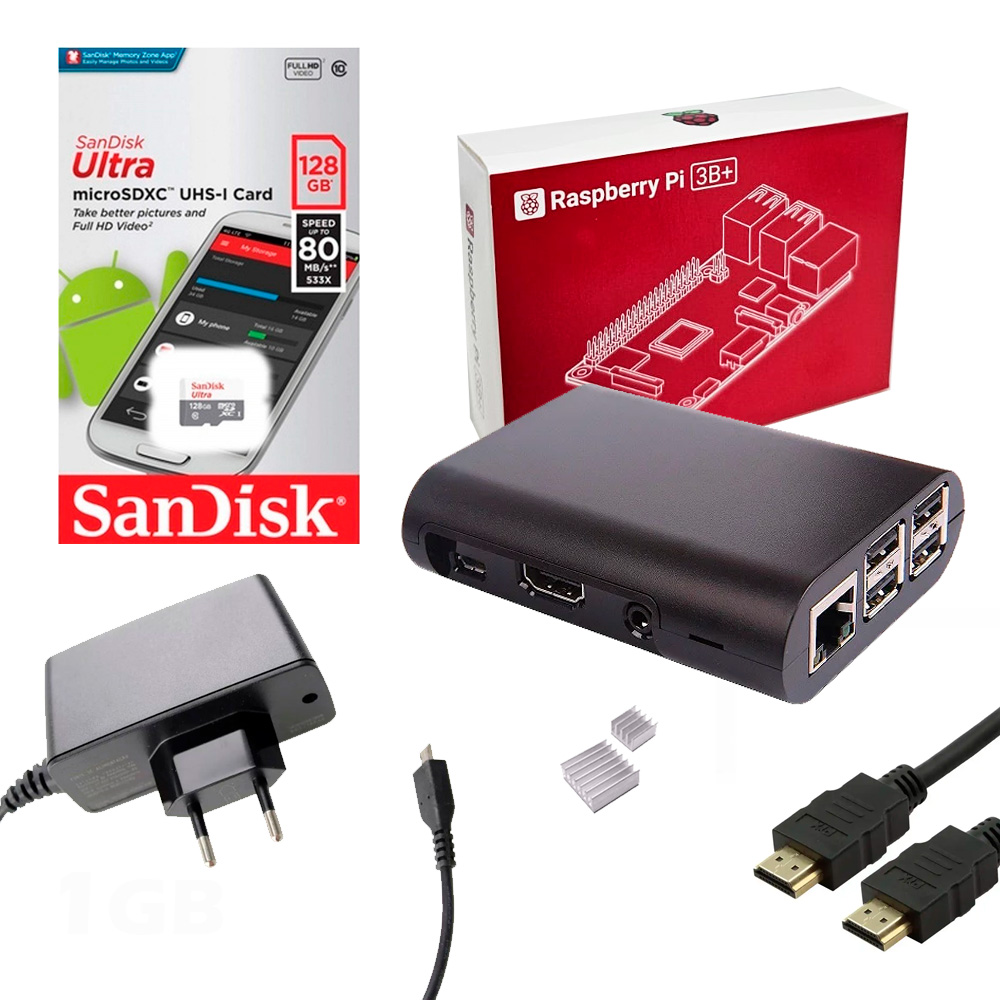 Kit Raspberry Pi 3 B+ 1GB com Cartão MicroSD 128GB, Case, Dissipadores, Fonte e Cabo HDMI